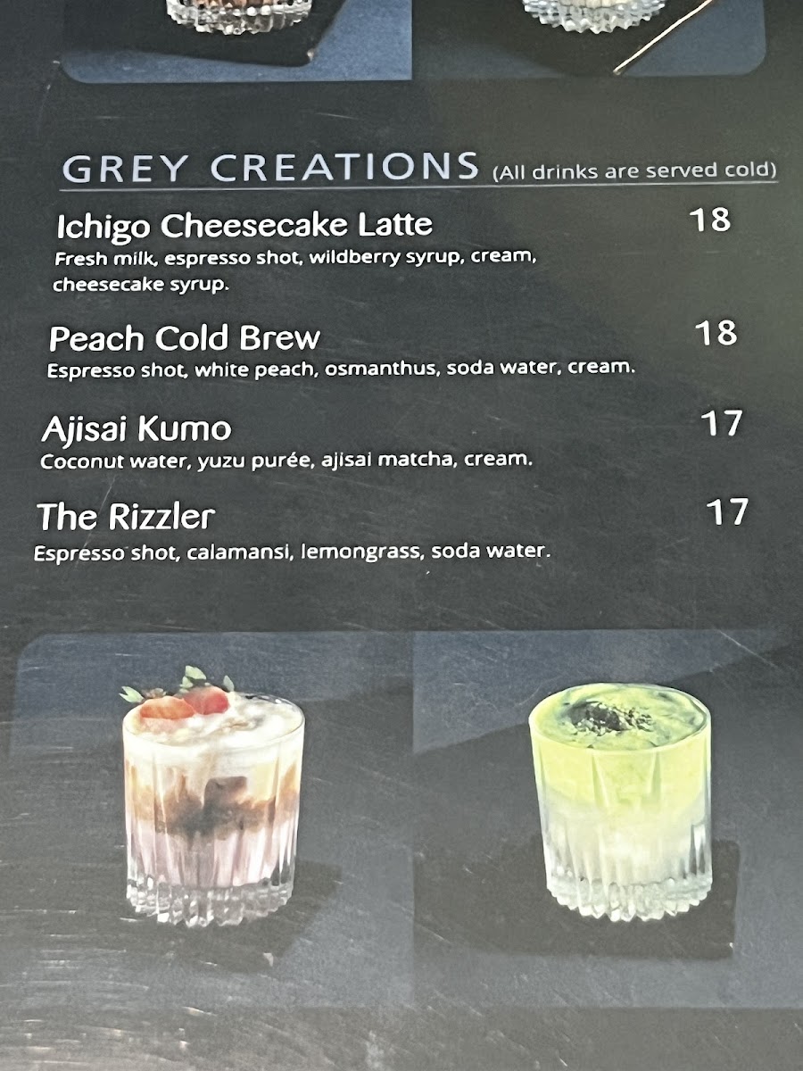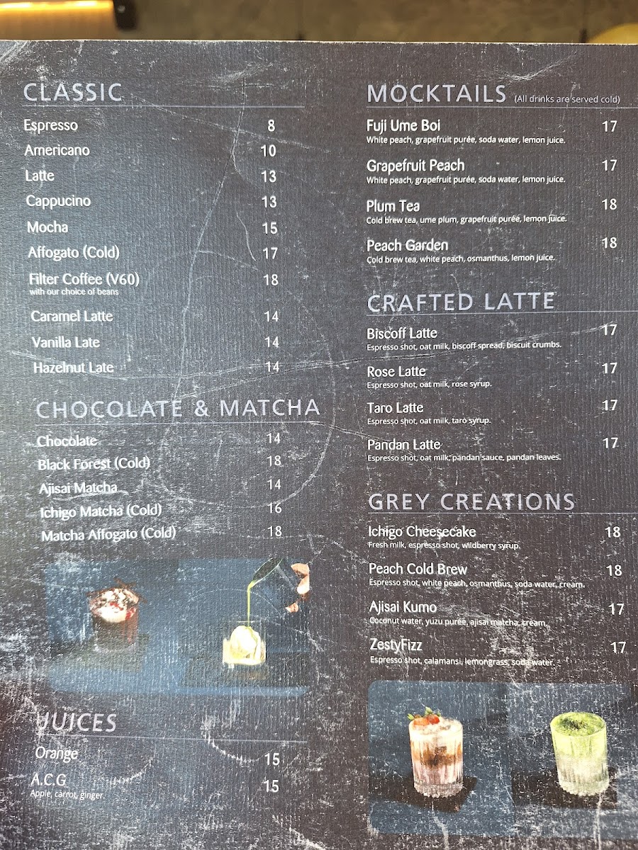 At Grey Café, coffee aficionados will find a selection of expertly crafted lattes that combine the rich, bold flavors of espresso with delightful ingredients. Picture yourself savoring the Biscoff Latte, a harmonious marriage of espresso shot, Biscoff spread, and biscuit crumbs, all enveloped in the creamy embrace of oat milk – a sheer delight at MYR 17.00. For something uniquely exotic, the Pandan Latte offers a fragrant twist, blending espresso with pandan sauce for a refreshing and aromatic experience. Don't miss their Rose Latte, where the floral notes of rose syrup dance beautifully with oat milk, creating an enticing blend that pleases both the palate and the senses.